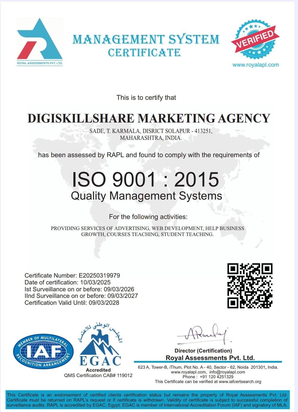 Digiskillshare Marketing Agency operates under internationally recognized ISO 9001:2015 Quality Management System standards. This certification reflects our commitment to professional service delivery, structured workflows and continuous improvement.